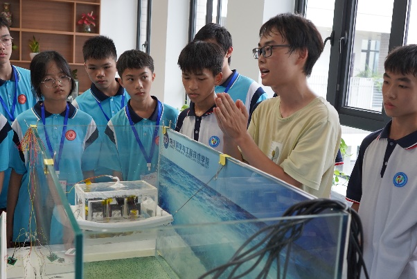 各实验室的研究生向同学们介绍实验仪器、科研项目,同学们也不时询问着项目的难点、亮点。物院研究生们耐心解答的同时,还引导研学团的同学们亲身参与。在蓝色能源实验室,研究生讲解了发电的基本原理后,鼓励同学们动起手来,亲身体验摩擦发电的过程。