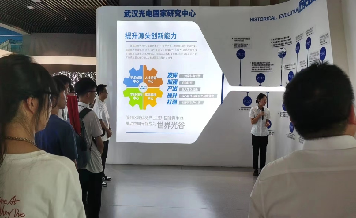 7月13日下午,实践队伍来到华中科技大学,在光电学院副院长聂明局带领下依次前往校史馆、集成电路产教融合平台、武汉光电国家研究中心展厅参观。在相关专家的讲解下,切身感受华中科技大学的深厚科技底蕴以及集成电路芯片的前沿制造工艺与创新发展。