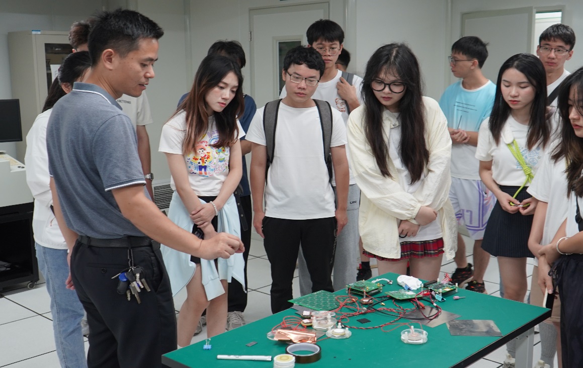 7月13日上午,实践队伍走进华中师范大学物理科学与技术学院,在王东老师的带领下参观了硅像素实验室、粒子探测实验室等实验平台,并聆听孙向明等3位老师分别介绍高速数据传输芯片、高速模数转换芯片和用于X射线偏振探测的芯片,老师们详细解释了芯片的工作原理、制造工艺和应用领域。在集体讨论和答疑环节中,同学们积极提问和交流,不断扩展自己的思维和知识面。