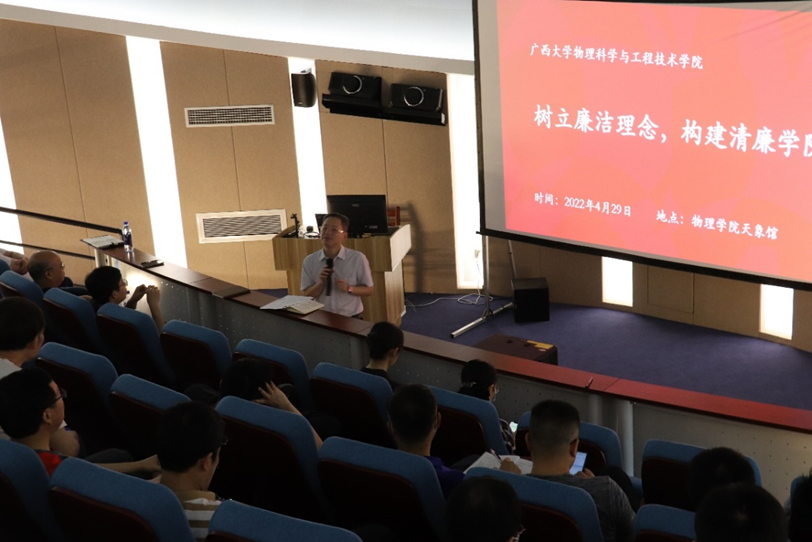 推进“清廉西大”建设的目标、三大具体任务以及十条具体措施,并结合学院的实际,从三个方面对清廉学院工作进行了部署。一是要以严肃的党内政治生活作为清廉学院建设的政治基础。学院领导班子要提高政治站位、要有担当意识,讲政治规矩政治纪律,负起管党治党的两个责任;全体党员要进一步强化党员意识,把“三会一课”等组织生活的要求落到实处,发挥党员的先锋模范作用。以优良的党风促院风、教风、师风、学风的建设。二是要把依法治理规范运行作为清廉学院建设的准绳。以继续完善党委会、党政联席会议制度、议事规则为契机推动学术委员会、学位委员会等非常设机构议事决策的科学化、规范化。仪器申购、项目申报、经费使用、办事请假等都要依规依流程。三是要坚持把师德师风建设作为推动教风学风建设的主要抓手。每位老师都必须牢记新时代高校教师职业行为十项准则,要洁身自好、谨言慎行,注意语言观点和行为方式,切莫因之引发舆情而给自己带来不可估量的负面影响。最后,他要求教职工要努力构建清廉家庭。教职工要督促住在校内的家属自觉遵守学校的规定,认真观看《家风不正遗祸患 清廉传家惠久远——领导干部家风不正典型案件警示录》,共同营造风清气正的教书育人环境。