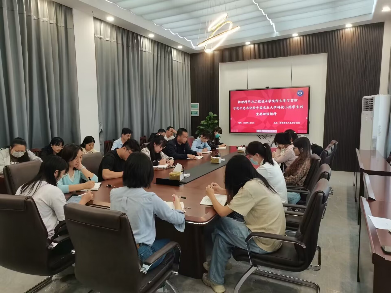 师生在天象厅会议室学习贯彻习近平总书记给中国农业大学科技小院学生的重要回信精神。