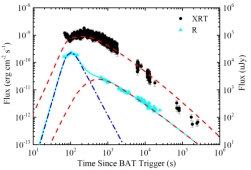 伽玛暴极早期光学余辉对于研究伽玛暴喷流性质和暴周介质环境具有非常重要的意义。博士生张璐璐和导师与国家天文台辛立平研究员等合作,利用兴隆观测基地的GWAC-F60A、TNT望远镜和2.16米光学望远镜对GRB 210104A进行细致的测光和光谱观测,结合多波段观测数据研究这个暴余辉和暴周环境性质。他们光谱观测结果获得了该暴的宇宙学红移为0.46,并在暴后67~152秒的观测到明亮的光学耀发。他们的理论分析表明早期光学辐射是由反向激波辐射主导,晚期的光学辐射则由正向激波主导,而且该暴的喷流为中等相对论、中度磁化(RB = 28),具有较高的辐射效率和较低的动能,暴周环境是致密的星际介质环境。该暴同典型的长伽玛暴在2σ置信度水平内同样遵循Lγ,iso − Ep,z − Γ0三参量关系。研究论文在《天体物理学杂志》(The Astrophysical Journal)发表。