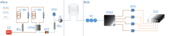 图中是我们的实验系统,LD表示商用激光二极管,BS1是75:25的光纤分束器,BS2是50:50的光纤分束器,是相位调制器,CPM是自制的偏振模块,ATT是光衰减器,IS是光学隔离,PC是偏振控制器,SPD是单光子雪崩探测器,PAM是偏振分析模块,TDC是 time-to-digital转换器。我们在接收端和发送端都使用保偏光纤。我们分别测量了系统发送端的制备不准确、诱骗态可辨,特洛伊木马参数以及接收端的探测效率不匹配。结果如图下所示: