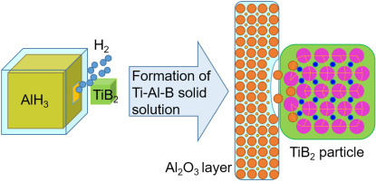 新能源材料团队刘海镇副教授与合作者通过调控球磨工艺参数以及引入TiB2改善了AlH3的放氢性能。在225 rpm转速下球磨108 min的AlH3 + 2.5 wt% TiB2具有最佳的放氢性能,其起始放氢温度为78 °C,比单纯AlH3低60 °C,放氢在130 °C终止,可获得8.5 wt%的氢气。此外,在80 °C的恒定温度下,在200 min内可放出5.3 wt%的氢气,而在相同条件下,单纯的AlH3几乎不能释放任何氢气。用Kissinger方法计算的AlH3 + 2.5 wt% TiB2的放氢反应活化能为86 kJ mol−1,比单纯AlH3低28 kJ mol−1。催化机理研究表明,AlH3表面的Al2O3层会与TiB2相互作用,形成Al–Ti–B固溶体,导致晶格畸变,使得晶格活化,从而改善AlH3的放氢动力学。这项工作为实现亚稳态AlH3的高容量和低温放氢提供了一种有效的策略。