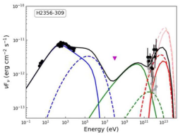 部分活动星系核在TeV能区呈现一个显著的超出轻子模型预期的辐射成分。这个成分的物理起源一直是争议中。研究小组研究了四个具有显著TeV超出的极端BL Lac天体,发现单区轻-强子辐射模型能很好解释其宽波段能谱。在这个模型中,从射电波段到GeV伽玛射线波段的辐射主要来自于电子(正电子)的同步辐射和逆康普顿散射,而TeV超出则主要来源于质子-光子相互作用。模型预言由级联过程产生的轻子辐射在keV-MeV波段有显著的贡献,在宽波段能谱中表现为平台或是峰状凸起。TeV超出与keV-MeV超出的联合观测有望给出强子辐射的关键证据。