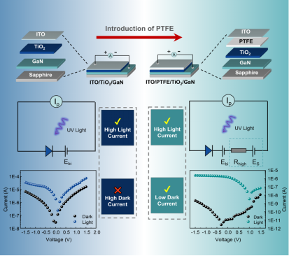 蓝色能源团队设计了一种基于PTFE驻极体调控增强的高性能ITO/PTFE/TiO2/GaN自驱动紫外光电探测器(UV PD)。驻极体PTFE的引入不仅较好地抑制了暗电流,其在PTFE/TiO2界面形成的内静电场与TiO2/GaN异质结内建电场的耦合作用还增强了光生载流子的分离效率,提升了探测性能。在0 V偏压下,ITO/PTFE/TiO2/GaN UVPD的光暗比相较于ITO/TiO2/GaN UVPD提高了2297倍,响应时间增快了1.69/2.96倍。进一步制备了具有表面TiO2微米圆柱的微结构M-ITO/PTFE/TiO2/GaN UV PD,在360 nm光照下,其具有高达3.65×105的超高光暗比,280.1 mA/W的响应度,1.97 ×1013 Jones的高探测率以及4.3/3.0 ms的快速响应时间。该研究为未来高性能的自驱动紫外光电探测器的设计提供了新的思路。