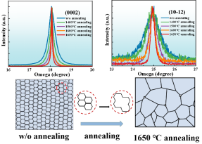 本文将磁控溅射技术与热退火技术相结合,探索了不同取向大错切角氮化铝薄膜的退火机理。高分辨率X射线衍射(XRD)测试表明,晶体质量的提高与衬底的错切角和错取向有关。此外,在大错切角薄膜的退火过程中发现了两个重要现象:(0002)和(10-12)以及E2(high)声子峰的半高宽和位置随退火温度的变化而变化。这些现象与退火过程中缺陷和杂质的演化有关。拉曼光谱、扫描电子显微镜(SEM)、光致发光(PL)和X射线光电子能谱(XPS)进一步揭示了退火过程中缺陷和杂质演化的本质。