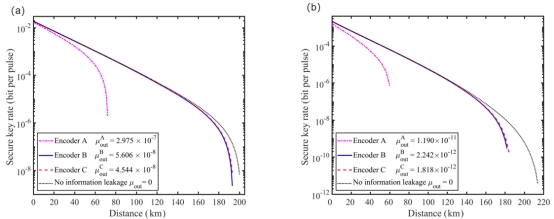 图2:(a) 三种编码方案应用于BB84-QKD系统的安全密钥率和无木马攻击情况下的安全密钥率。(b) 三种编码方案应用于MDI-QKD系统的安全密钥率和无木马攻击情况下的安全密钥率。