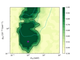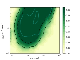 在纯湍流和有序的情况下,利用NGC 1275对类轴子参数的限制结果。黑色虚线(实线)对应95%(68%)的置信度。淡蓝色线为前人的限制结果。