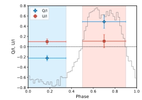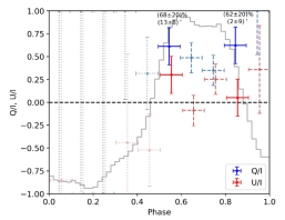 脉冲星主峰的偏振度为50%(误差为13.1%),偏振角的测量值为6.2度(误差为7.4度),探测显著度超过3.8倍sigma;采用同时拟合脉冲星与脉冲星风云斯托克斯参数的方式,发现在主峰两侧相位区间的偏振度分别为68%(误差为20%)与62%(误差为20%),测量显著度均超过3倍sigma,而中间两个相位区间显著性较低。该脉冲轮廓被视为两个高斯函数的叠加,相位分辨的偏振特征可能起源于两个成分重叠的结果。