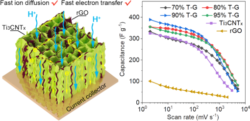 新能源团队设计了三维垂直多孔Ti3CNTx基复合气凝胶以助力超级电容器倍率性能的提升。将石墨烯(rGO)与Ti3CNTx结合,并通过单向自下而上的冻结过程制备Ti3CNTx/rGO复合气凝胶,构建垂直的离子扩散路径。石墨烯纳米片的嵌入可以有效减弱Ti3CNTx纳米片的再堆积,扩大MXenes层间距,提高材料利用率。此外,石墨烯纳米片的加入也可以提高混合气凝胶的机械强度,并在MXenes纳米片之间提供高导电网络。垂直多孔结构大大缩短了离子的扩散路径,提高了电解液离子的可及性。Ti3CNTx/rGO混合气凝胶的比电容可达390 F g-1,尤其在1000 mV s−1下仍能保持205F g-1的高比电容。组装的全固态对称SCs在154 mW g -1的功率密度下可提供5.0 mWh g -1的高能量密度,并具有良好的循环稳定性。所采用的单向自下而上的冻结过程简单、易于操作,可扩展到其他MXene基混合气凝胶的制备,促进了MXenes和其他二维纳米材料在高功率超级电容器中的应用。