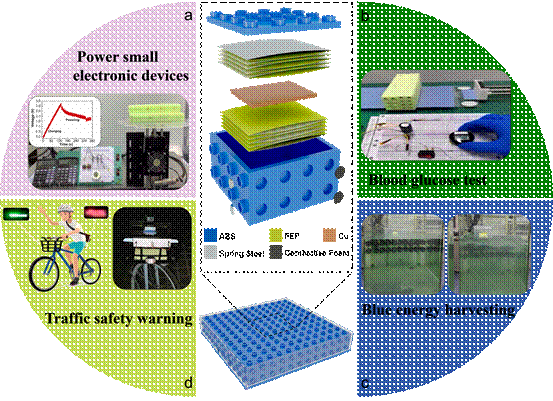 蓝色能源团队受乐高积木启发,研制出一种小体积、高能量密度的多功能摩擦纳米发电机(LI-TENG)。其特性类似于电池,具有结构紧密、无需额外导线连接即可快速组装拼接、空间利用率高等特点,可用于各种低频振动机械能的收集。通过采用弹簧钢片拱形叠层结构,单个LI-TENG可实现高达760 nC的转移电荷和210 V的开路电压,在低频(<5 Hz)机械振动下电荷输出体积密度可达7 mCm−3,负载电阻为2.72 MΩ时的体积功率为48.47 Wm−3。LI-TENG成功应用于车辆夜行警示、蓝色能源采集等多种实际场景中。LI-TENG的提出为设计通用性更广的TENG及其阵列提供了新思路。