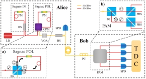 图一 具有稳定收发端的QKD系统装置示意图。a. Sagnac POL模块示意图;b. PAM模块示意图。