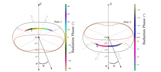 研究人员发现这颗星很强的辐射窗口,即图2中的I和M点非对称地分布在子午面的两侧。这个观测结果间接反映出脉冲星表面物理,在该脉冲星极冠区表面可能分布着高度不同的小山峰,这些山峰导致脉冲星表面不同区域有着优先级不同放电顺序,使得强辐射窗口远离子午面。脉冲星的表面与脉冲星物态方程密切相关,而由夸克物质组成的脉冲星相比于传统中子星更容易形成小山峰。该研究成果已于2024年2月29日发表在国际天文学杂志The Astrophysical Journal上。