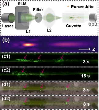 图 1 尖点灾难贝塞尔光束捕获不同尺寸Cs3Cu2I5钙钛矿颗粒的实验照片。