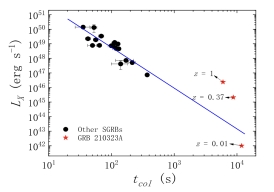 图2. GRB 210323A的坍缩时标-光度关系;
