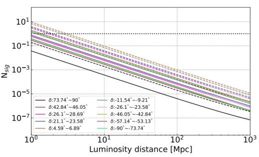 图3. 对于类似GRB 211211A的伽马暴的预期中微子事件数和距离的关系