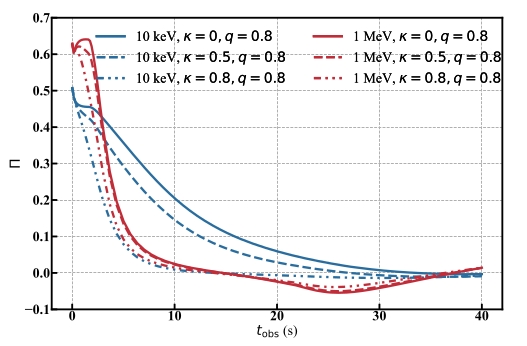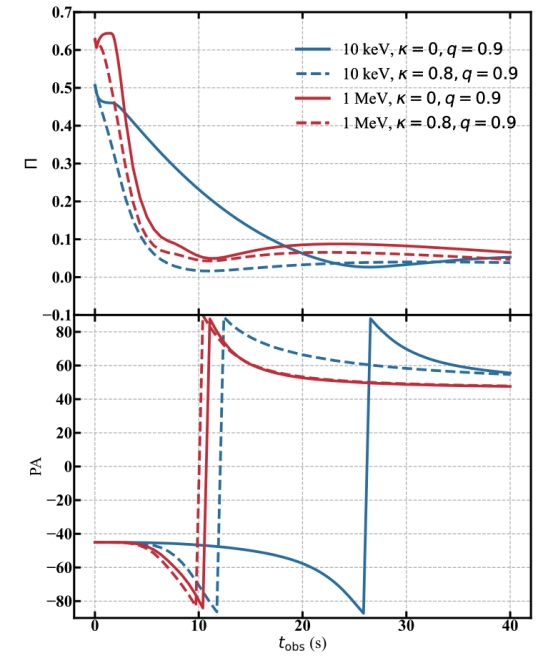 论文采用了ICMART模型所描述的情况进行计算,同时将磁场分为有序和随机成分。研究中的偏振度计算基于同步加速辐射理论,通过模拟随机磁场和观测角度的变化来获得相应的偏振度。研究中考虑了多种可能的磁场分布,包括完全有序的磁场、部分随机的磁场,以及完全随机的磁场。结果显示,随机磁场的存在会显著降低偏振度。完全有序的磁场可以产生较高的偏振度,而增加随机成分则会逐渐降低这一数值。同时随机磁场成分的逐渐上升,会导致低能X射线的偏振发生显著变化,这种变化可以依靠POLAR2中的LPD和HPD进行区分,将GRB中的一个脉冲分为前后两段,我们预计当无序磁场的成分增长较慢的情况下,LPD在前半段的偏振度会比HPD要低,后半段LPD探测偏振度要高一些。当无序磁场的成分增长很快,LPD和HPD将会看见相似偏振结果。相关成果已在《The Astrophysical Journal》杂志发表。
