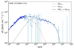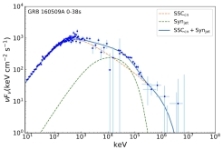 假设呈指数衰减速度分布,如果MJC区域磁场强度为100 G,内边缘速度为0.9c,则MJC区域的剪切流可以将注入的γe=300的电子加速到γe,max=104。这些电子的冷却主要由SSC过程控制,发射通量峰值在keV带。同时,假设喷流核心体洛伦兹因子为300,射流核心的磁场强度为10⁶G,内激波加速电子(γe=10⁴—10⁵)的同步辐射能量通量在keV−MeV带附近达到峰值。将射流核心和MJC区域的通量相加,总光谱能量分布(SED)显示出与伽马射线暴宽带观测相似的特征。我们提出的模型对GRBs 090926A、131108A和160509A中观察到的类双峰和Band函数截断式光谱进行了很好地描述。