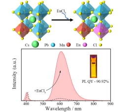 通过引入稀土元素铕离子(Eu3+)对Mn2+:CsPbCl3纳米晶进行共掺杂,显著提高了纳米晶的PL QY,达到90.92%。Eu3+的掺入减少了非辐射复合,提升了激子向Mn2+的能量转移效率,并增强了紫外光和水的稳定性。该方法不仅优化了发光性能,还为开发更高效的钙钛矿纳米晶材料提供了新的思路。相关结果发表在《Journal of Rare Earths》(DOI: 10.1016/j.jre.2024.06.008,中科院一区)