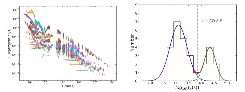 左图:样本X射线光变曲线; 右图:X射线bump峰值时间统计结果