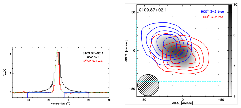 图1 左图为G10907+02.1的平均谱线图,右图为G10907+02.1的线翼积分流量空间分布图。