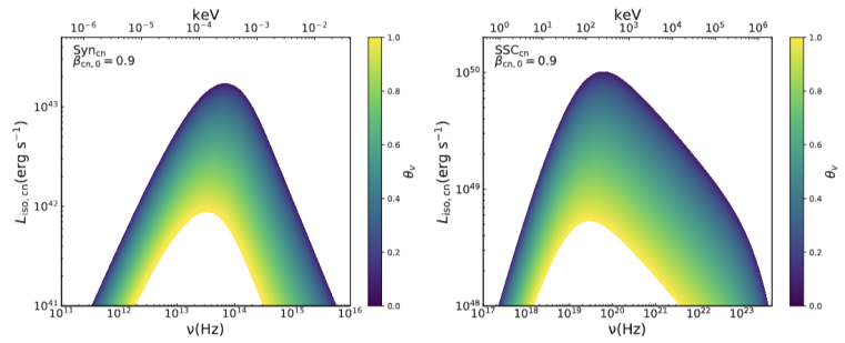 图2:激波加速电子同步辐射(左)和同步自康普顿辐射(右)随视角的变化