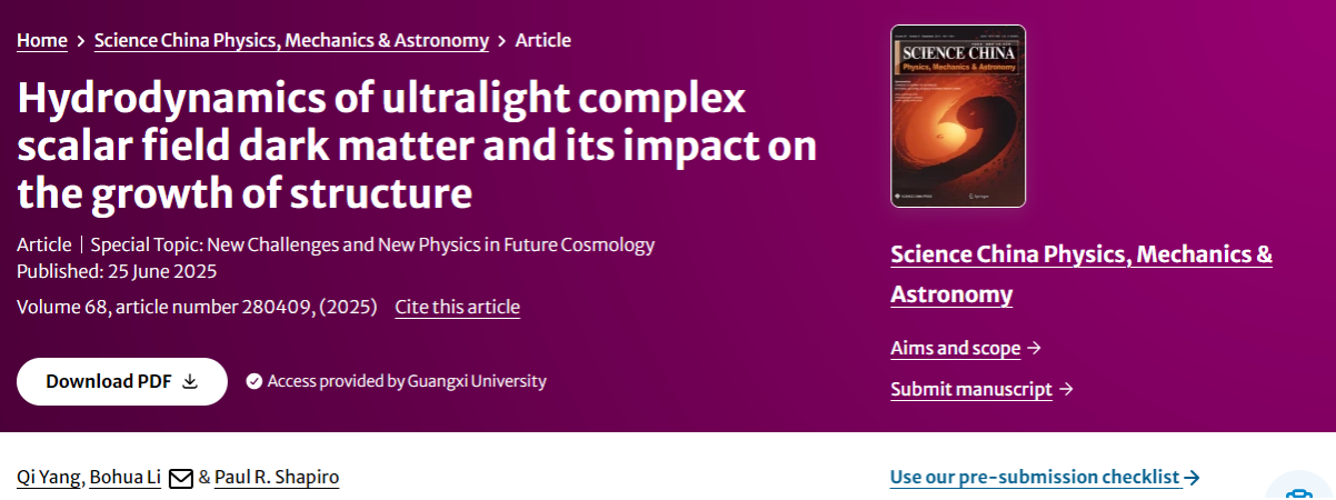 近日,我院宇宙学团队在暗物质研究领域取得新进展。研究结果以题目为“Hydrodynamics of ultralight complex scalar field dark matter and its impact on the growth of structure”的论文发表在中国科学院一区期刊Science China Physics, Mechanics & Astronomy (SCPMA)。论文的第一作者为麻豆视频