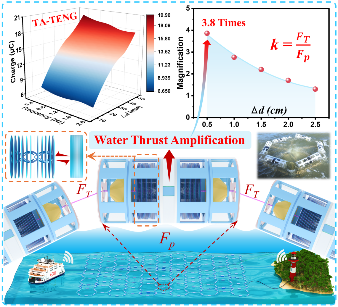 蓝色能源团队设计了一种基于几何增益原理的推力放大型摩擦纳米发电机(Thrust-Amplifier Triboelectric Nanogenerator, TA-TENG),通过引入几何增益原理,首次实现了水推力推力放大,构建了可扩展的自行阵列化全频波能采集平台。通过外部张力绳结构将波浪微小推力几何放大至原始值的 3.8 倍,实现高密集摩擦层在全频段波浪条件下的有效接触与分离。核心TENG单元结构采用四螺旋结构设计,由激光镂刻的硅锰钢片和PTFE薄膜构成,具备结构支撑、弹性回复、摩擦起电与导电等多功能集成特性,无需骨架、电极衬底与内部分线,显著减轻质量、简化制作工序,并增强浮力与海洋适应性。实验结果表明,单个 TA-TENG 可实现峰值输出 488 V 、 217 μA 、19.9 μC,功率密度达 24.9 W/m³,在造浪池模拟水波环境与实际北部湾海域测试中,可稳定为多种电子设备供电,验证了其在真实海洋环境中的多频响应与稳定供电能力。所构建的六单元自行阵列系统展现出优良的协同抗波性能及阵列耦合响应潜力。该研究为海洋蓝色能源的大规模开发和自驱动海洋物联网设备供能提供了关键技术支撑与结构参考。